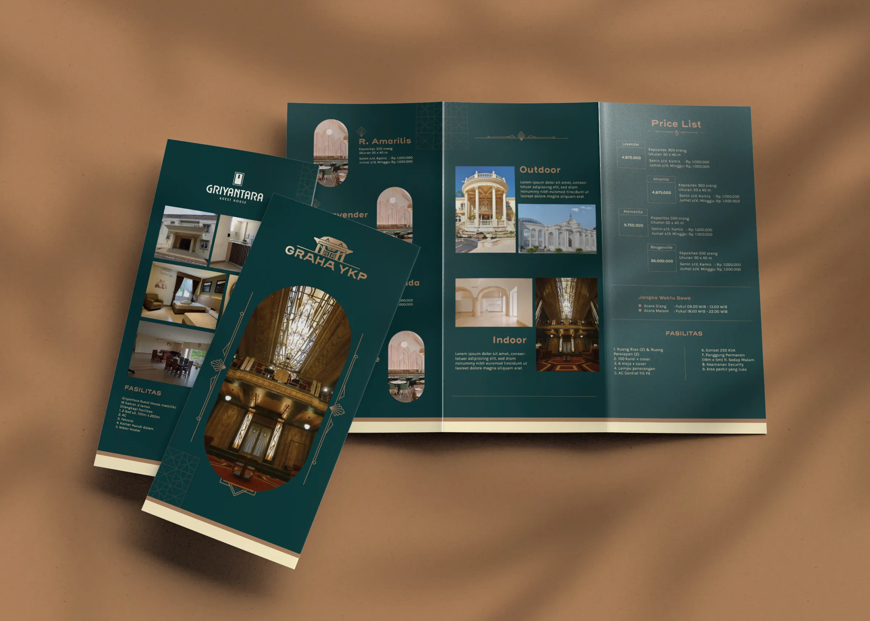 For Wisma Wijaya Kusuma, we redefined the brand entirely—renaming it Griyantara, a shorter and more approachable name meaning “pleasant house.” We developed a new identity and tagline with a modern Art Deco influence, establishing Griyantara as a distinct accommodation brand rather than a derivative extension of Graha YKP.